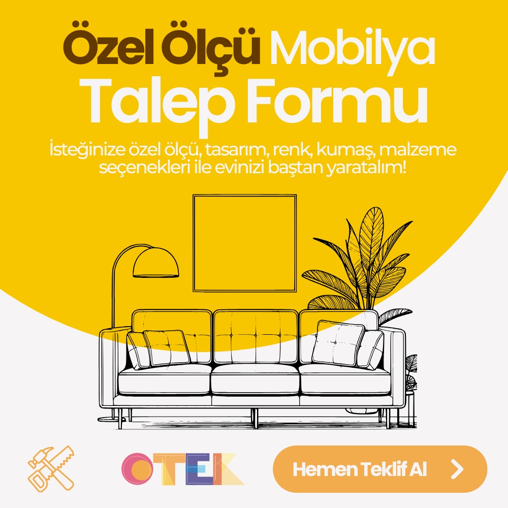 Her yaşam alanı özeldir, her müşterinin beklentisi farklıdır. Bu bilinçle hareket eden Otek Home, hazır kalıplara bağlı kalmadan tamamen müşteriye özel ölçülerde ve tasarımlarda özel üretim mobilyalar tasarlar. Oturma grupları, köşe koltukları, berjerler, yemek masası takımları ve TV üniteleri gibi ürünler; mekânınızın ölçülerine, tarzınıza ve kullanım ihtiyaçlarınıza göre üretilir.